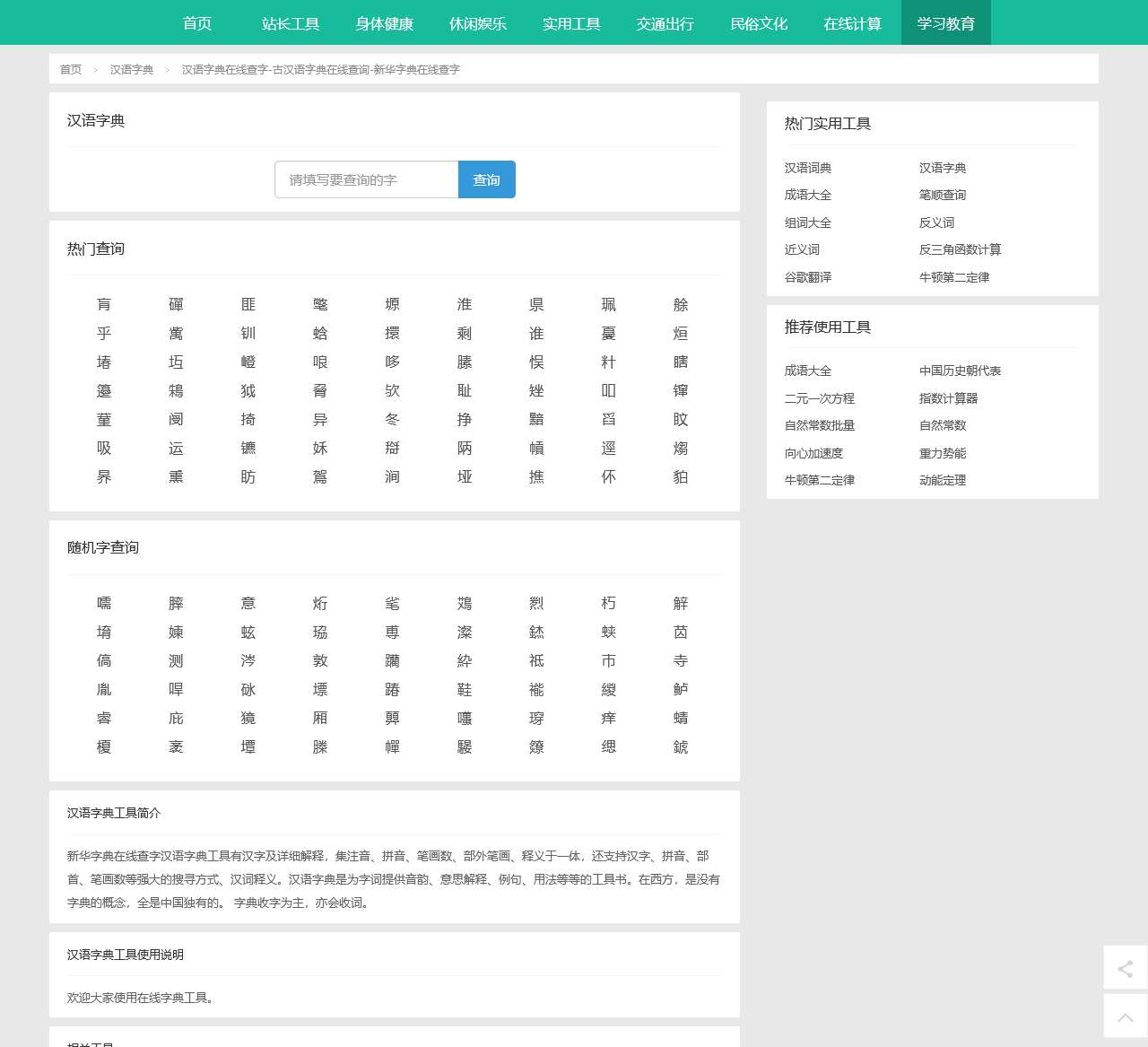 新华字典在线查字汉语字典工具有汉字及详细解释,集注音、拼音、笔画数、部外笔画、释义于一体,还支持汉字、拼音、部首、笔画数等强大的搜寻方式、汉词释义。汉语字典是为字词提供音韵、意思解释、例句、用法等等的工具书。在西方,是没有字典的概念,全是中国独有的。 字典收字为主,亦会收词。