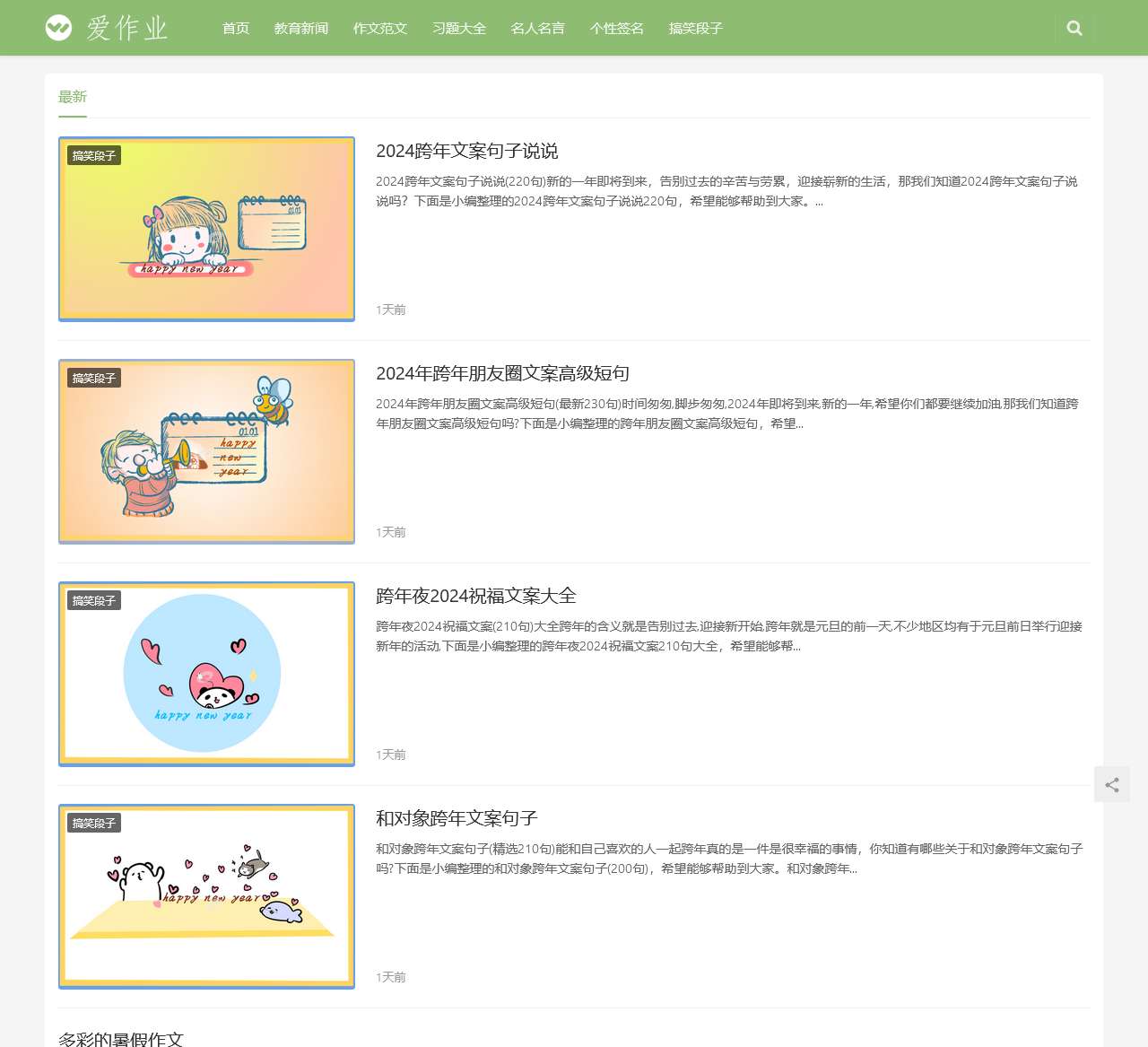 在爱作业网,我们努力为用户提供全面的教育资源,不仅涵盖教育新闻、作文范文,还包括名人名言、个性签名和搞笑段子,为用户提供一站式服务。我们希望通过这些内容,为学生、家长和广大用户带来更多的知识和乐趣。