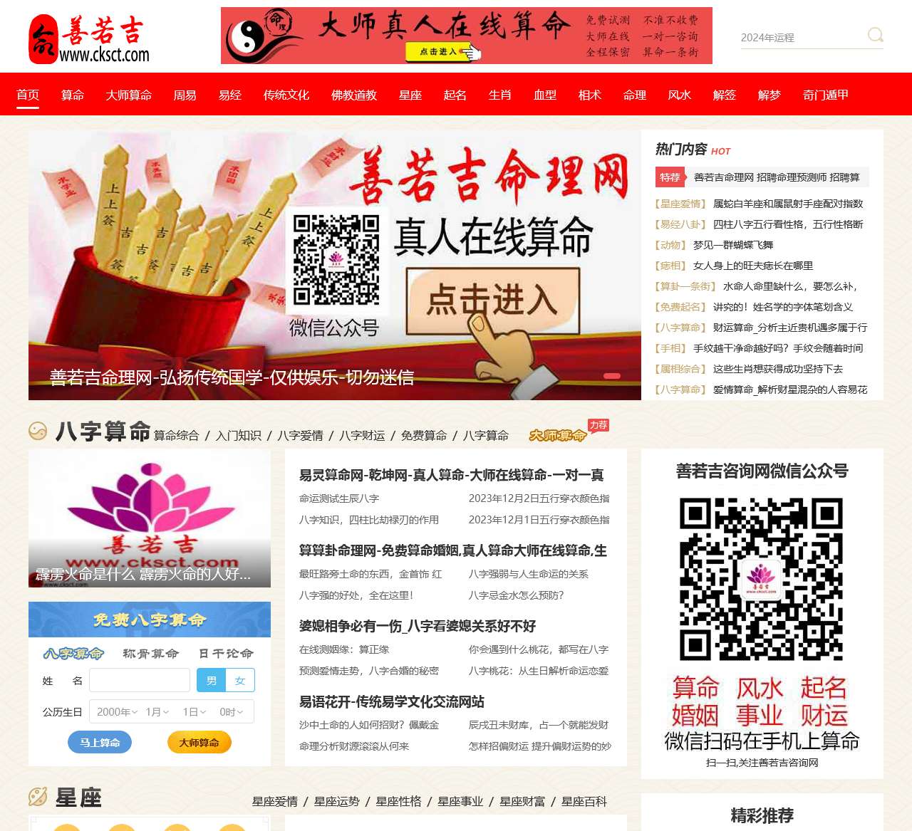 善若吉命理网是一家专业的命理网站,致力于弘扬传统国学,为用户提供准确、全面的命理服务。我们拥有真人算命大师,通过在线算命、易经、周易算命等方式,为用户解读八字、六爻、紫微斗数等命理信息,助您了解命运脉络,指引人生方向。以下是我们网站首页的主要内容及服务: