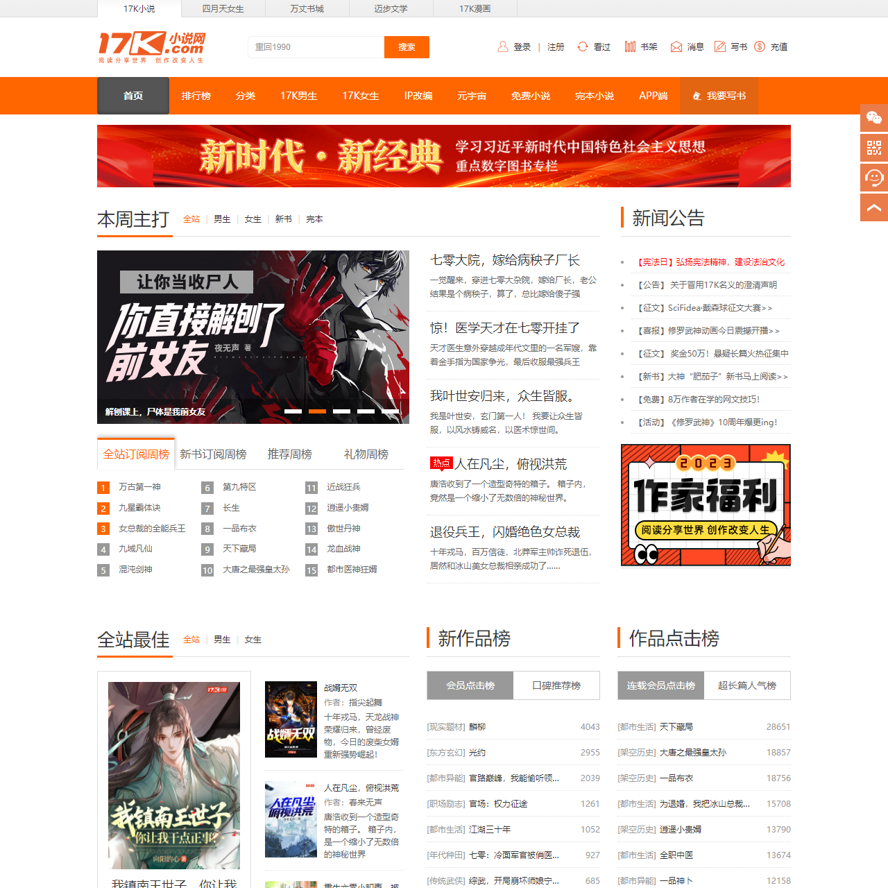 欢迎来到17K小说网,一个专注于提供最新小说下载的平台,一起免费享受精彩小说的世界。在这里,我们整理了丰富的小说资源,包括热门排行榜、不同分类、男生和女生专区、IP改编作品、元宇宙探索,以及免费小说和完本小说等,为广大读者提供了丰富多样的选择。