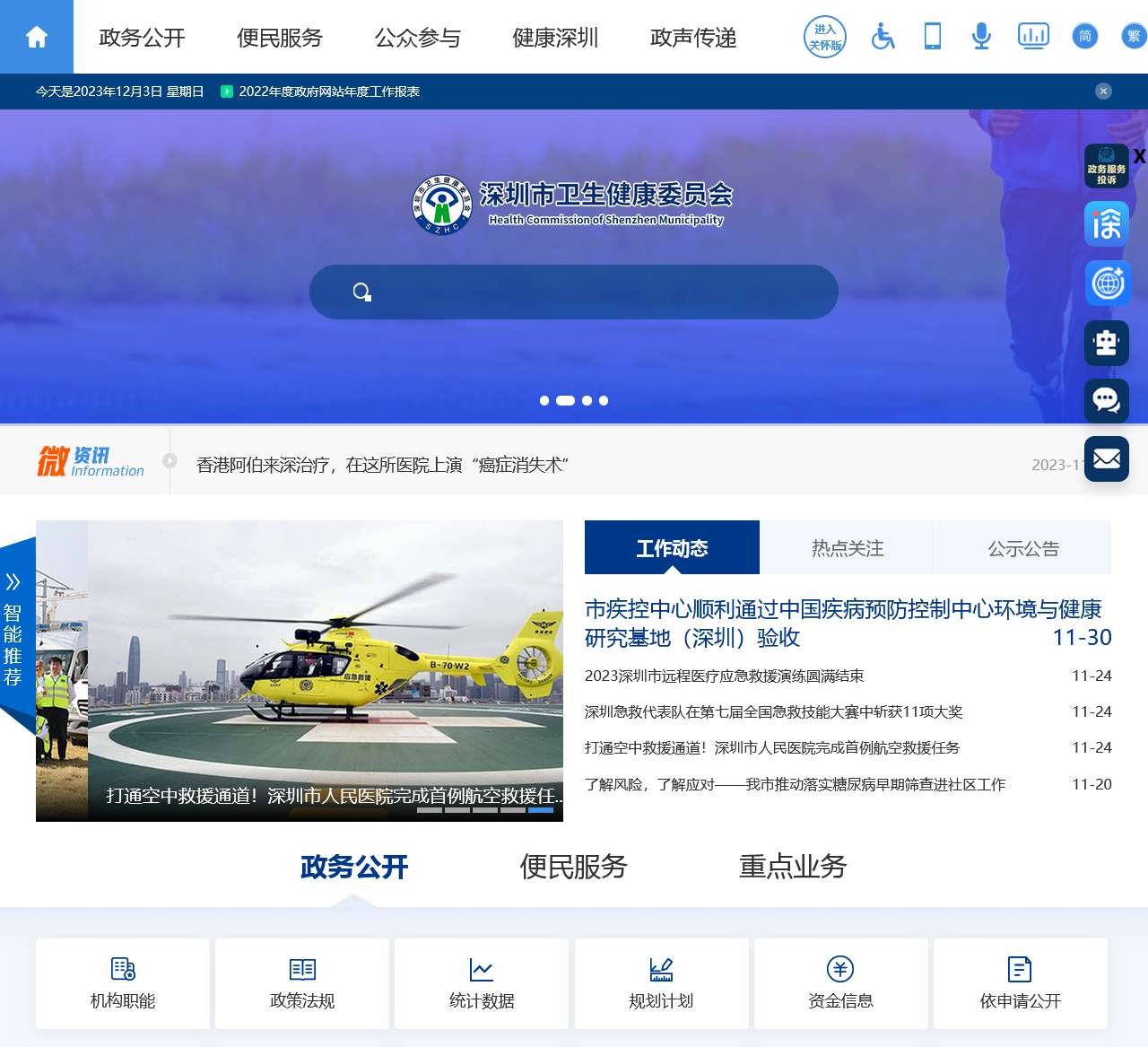 欢迎访问深圳市卫生健康委员会官方网站,我们致力于为市民提供全面、及时的卫生健康信息和服务。通过以下主要板块,您可以轻松了解最新的政务公开、便民服务、公众参与、健康深圳和政声传递等内容。