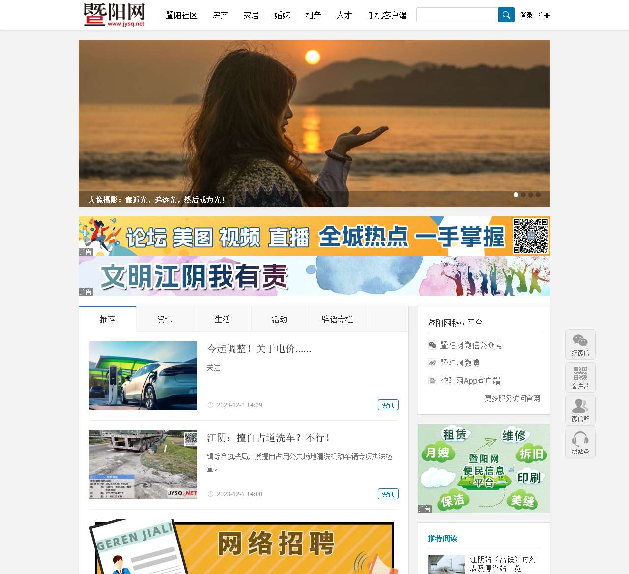 欢迎访问暨阳网,您身边的生活助手!暨阳网致力于为江阴市民提供全面、实用的资讯服务,涵盖房产、家居、婚嫁、相亲、人才等多个方面。通过我们的手机用户端,您可以随时随地获取最新的社区动态。