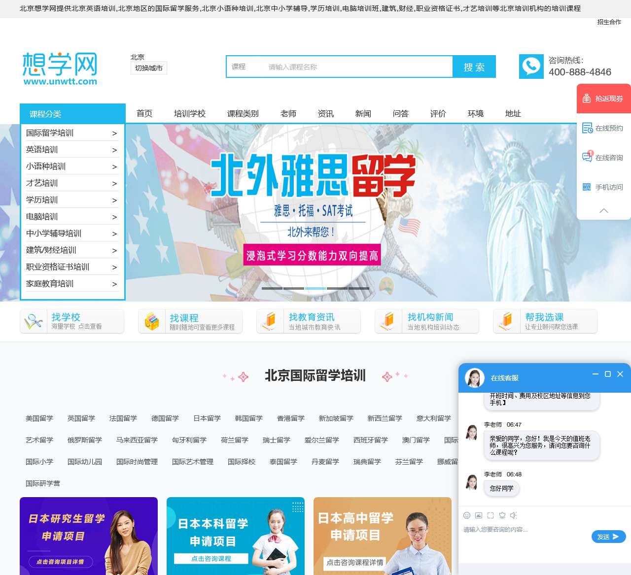 北京想学网提供北京英语培训,北京地区的国际留学服务,北京小语种培训,北京中小学辅导,学历培训,电脑培训班,建筑,财经,职业资格证书,才艺培训等北京培训机构的培训课程