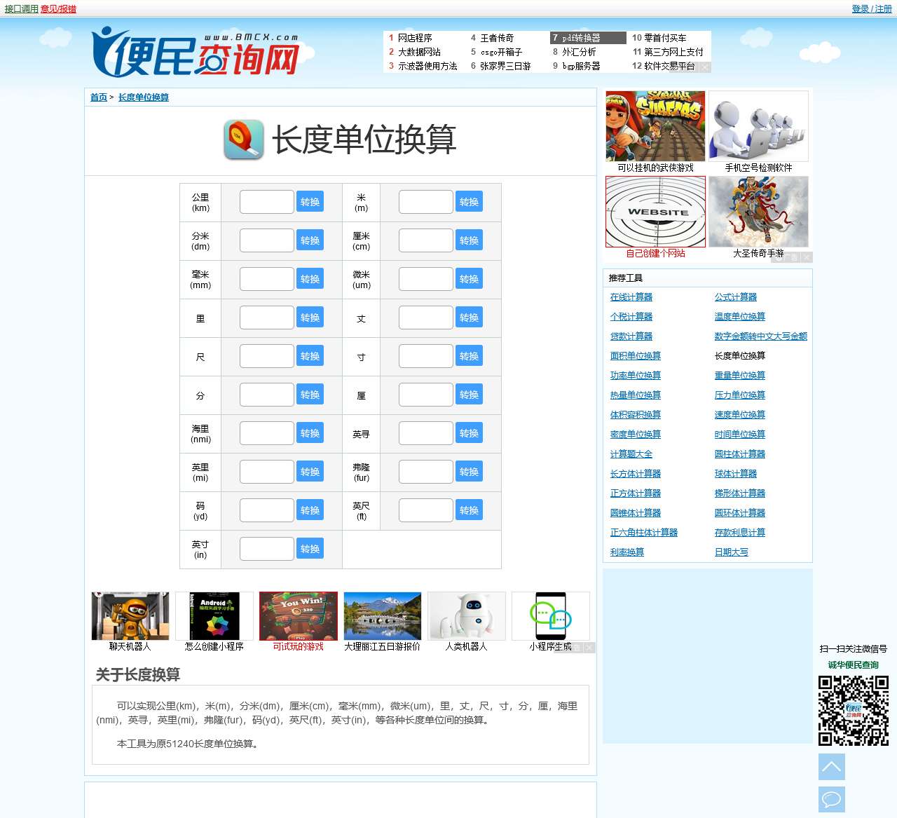 欢迎访问便民查询网的长度单位换算页面,您可以通过我们提供的在线计算器进行各种长度单位的转换。我们为您整理了一系列常用的长度单位,包括米、千米、英寸、英尺等,以方便您快速准确地进行换算。以下是我们提供的长度单位列表: