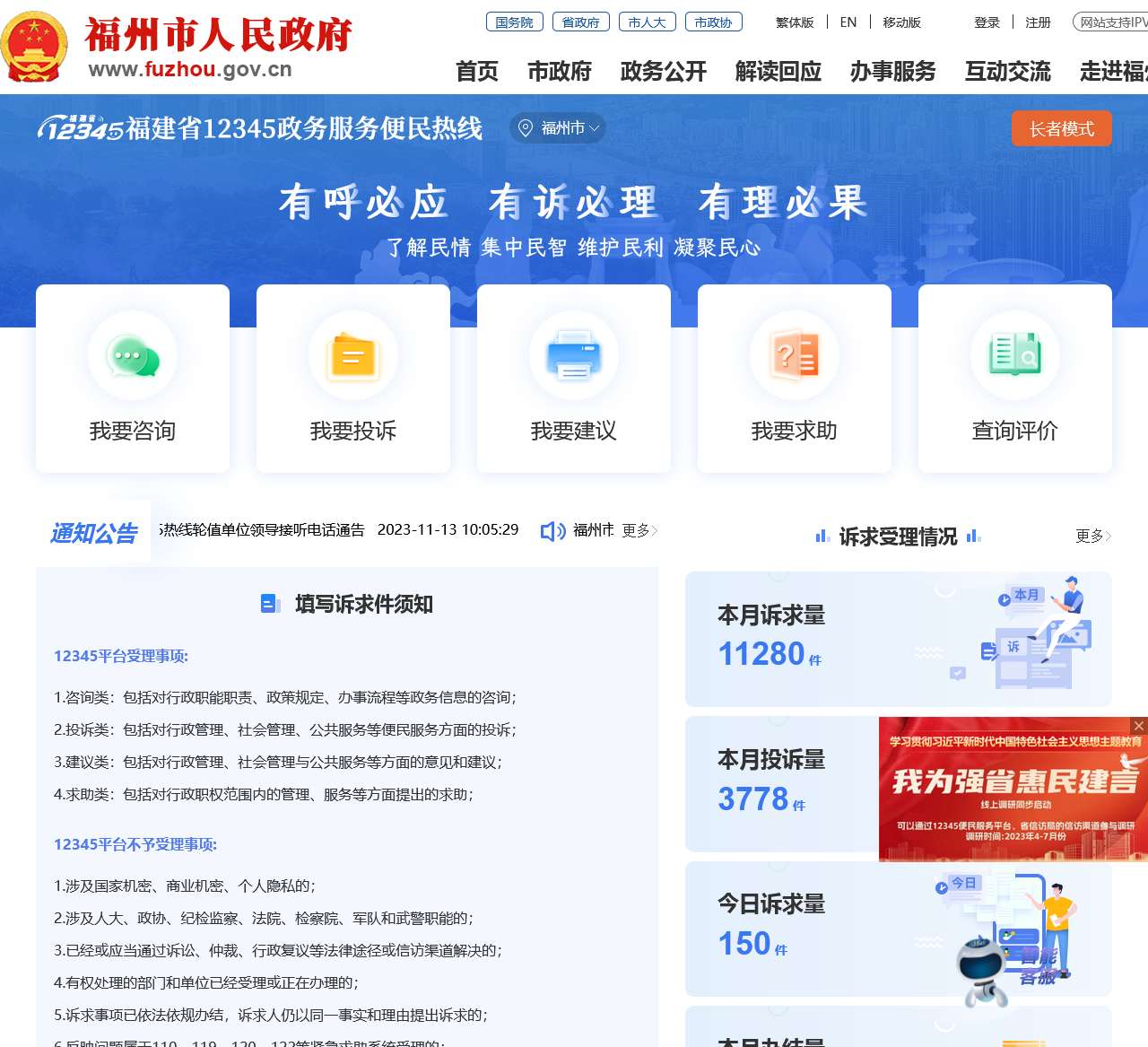 福州市12345便民服务平台为方便市民生活,提供了丰富多彩的政务服务和信息资源。以下是该平台首页内容的整理: