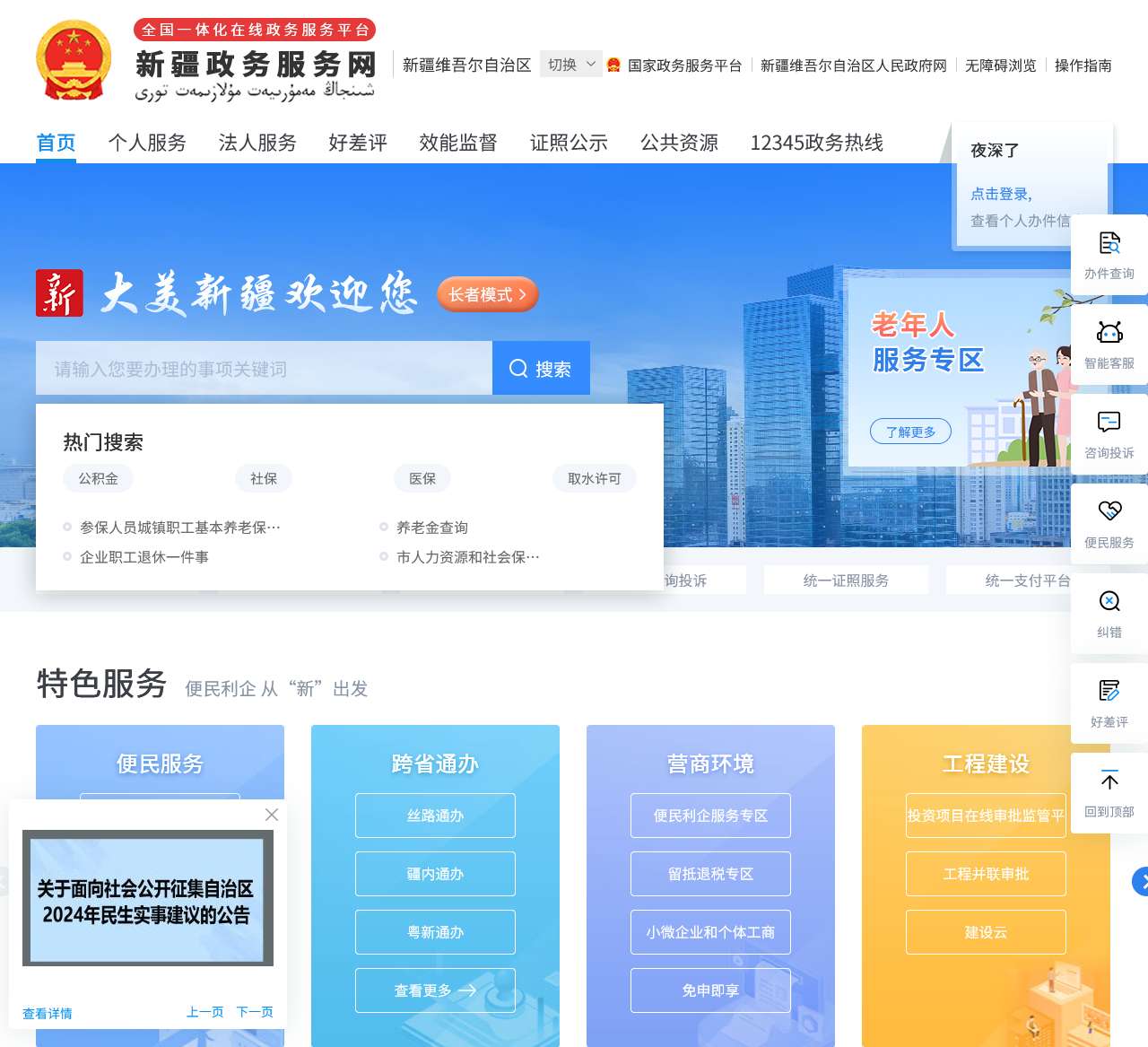 新疆政务服务首页为广大用户提供了便捷高效的服务平台,通过点击进入,您可以访问到新疆维吾尔自治区国家政务服务平台和新疆维吾尔自治区人民政府网,为您的个人和法人服务提供了多项便民服务,涵盖了法人服务、好差评、效能监督、证照公示、公共资源等多个领域。