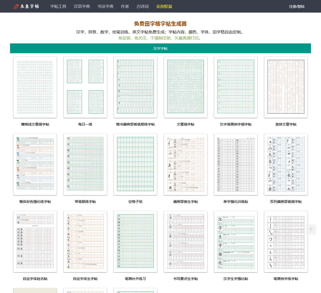 欢迎注册成为会员,享受更多专属权益。无论是硬笔书法字帖,还是毛笔字帖,木鱼工具都为您提供丰富的选择。网站支持自定义字体姓名帖和生字帖,让您个性化学习。