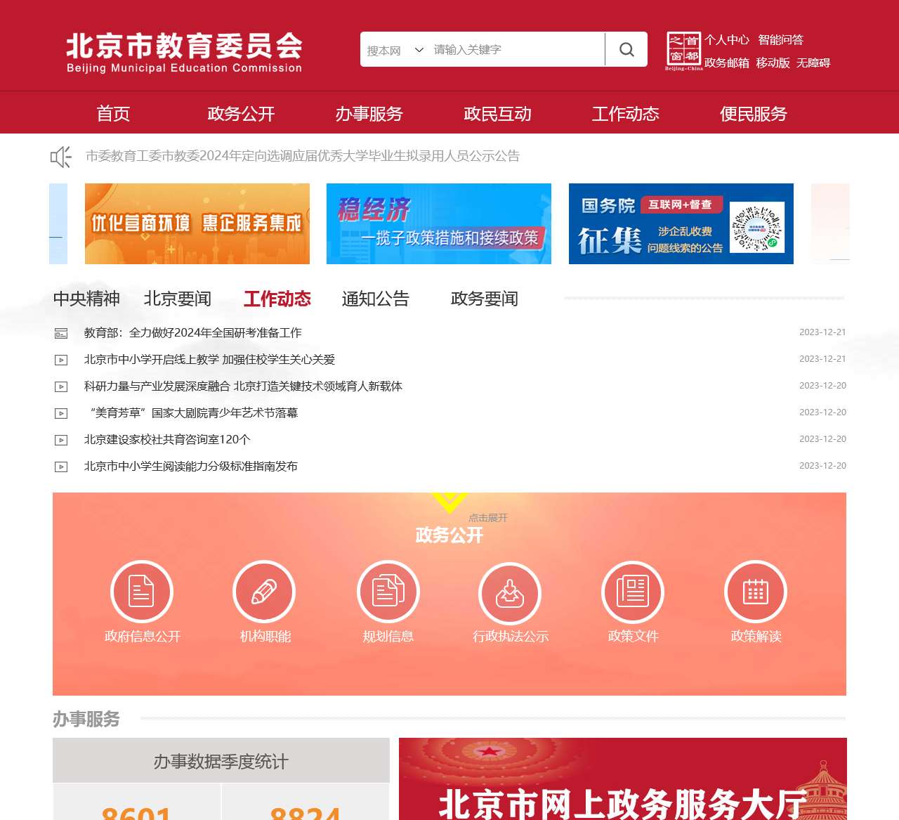 北京市教育委员会门户网站由北京市教育委员会主办,北京教育网络和信息中心负责运行维护,是北京市教委和各处室在互联网上发布教育相关信息和提供在线服务的综合平台,权威发布北京市教育重大决策部署和重要政策文件以及各类便民提示,搭建北京教育与公众互动的交流渠道,展示北京教育风貌。
