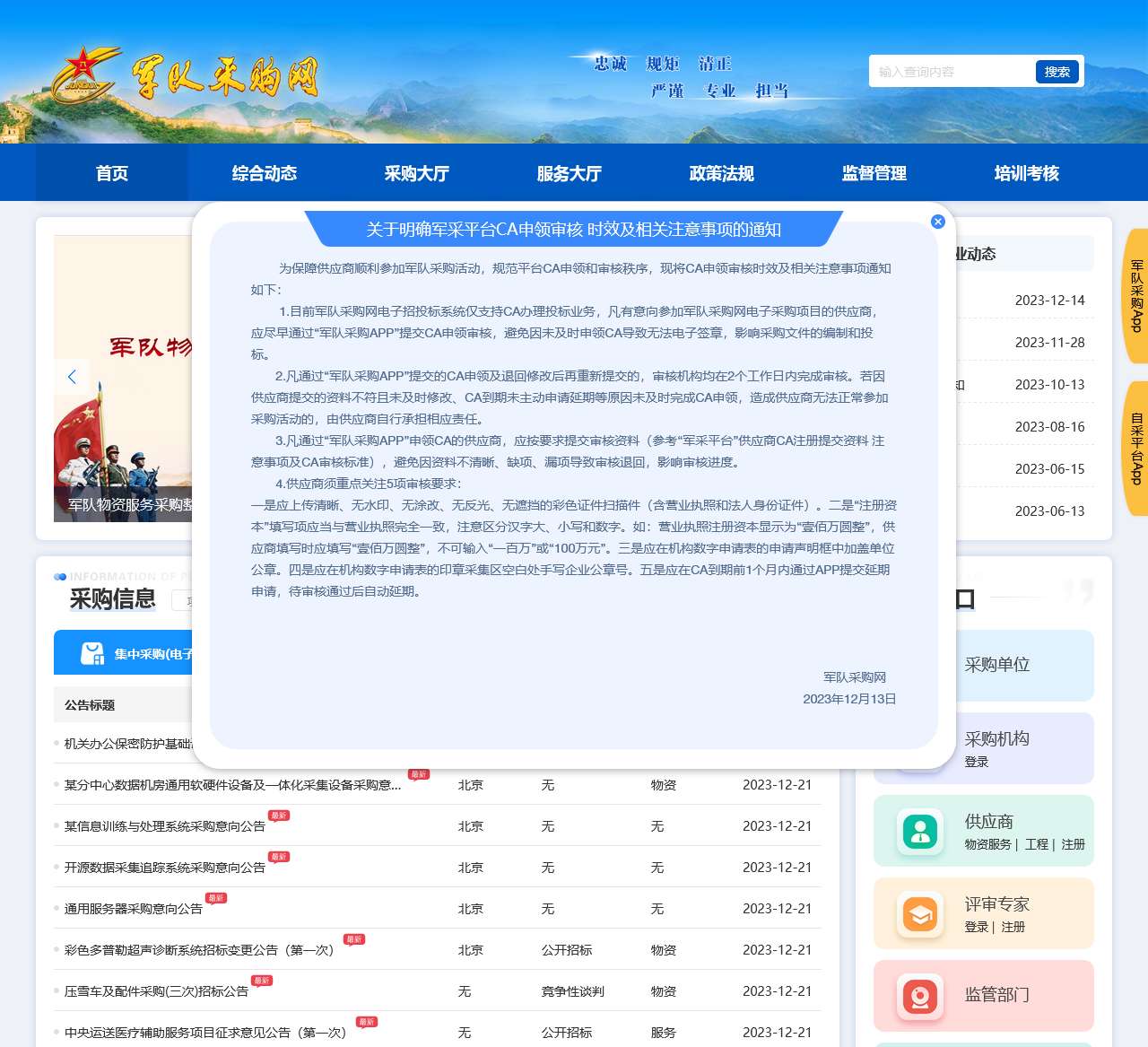 获取关于军队采购的通知公告、行业动态,包括明确军采平台CA申领审核时效及相关注意事项的通知、编目用户终端软件更新发布通知等。