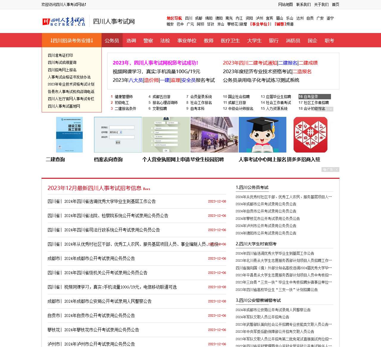 | 考试类别 | 事业单位 | 辅警 | 公务员 | 选调 | 警察 | 法检 | 事业单位 | 教师 | 医疗卫生 | 大学生 | 银行 | 消防员 | 国企 | 职考 | 四川准考证打印 | 四川考试成绩查询 | 四川招考网上报名 | 人事考试合格证书发放办法 | 2023年专业技术资格考试计划 | 各县市人事考试机构咨询电话 | 四川人社厅官网人事考试专栏 | 四川人事考试基地网 | 2023年,四川人事考试网祝您考试成功! | 2023年四川二建考试通知 | 二建报名 | 二建成绩 | 视频网课学习,真实:手机流量100G/19元 | 2023年度经济专业技术资格考试 | 二造报名 | 八大员 | 造价师 | 一建 | 监理 | 安全员 | 公务员录用电子化考试练习测试系统 |