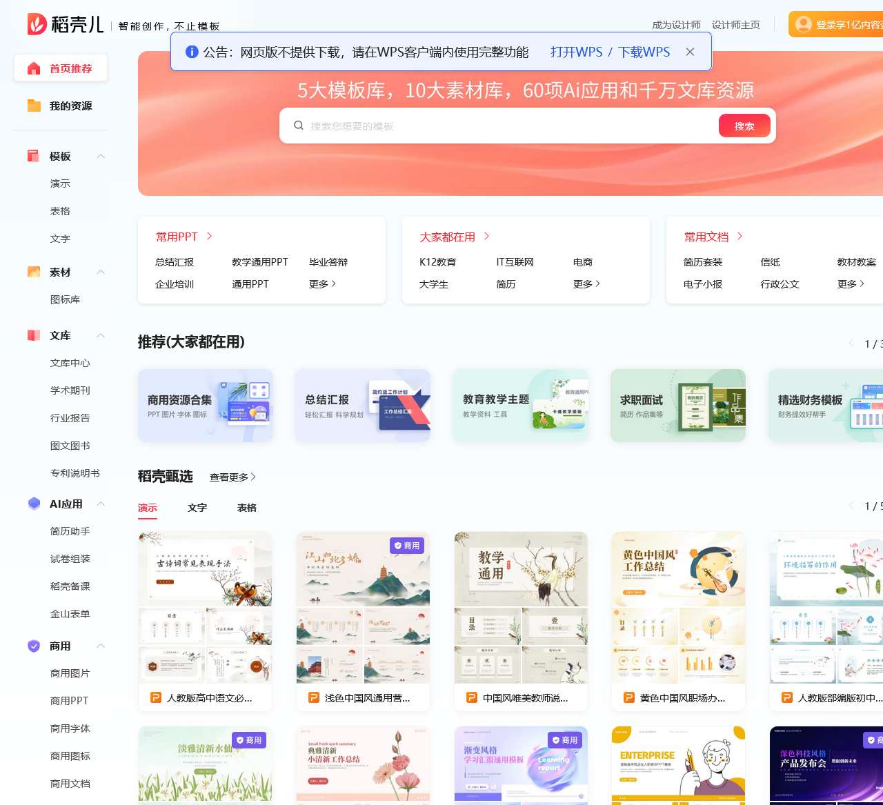 欢迎访问稻壳儿官网,您的WPS模板内容服务平台。我们致力于为用户提供丰富多样的模板资源,涵盖了PPT模板、文字模板、表格模板等多品类模板,以满足您在工作、学习、创作等各个场景的需求。通过稻壳儿,您可以轻松获取精美办公模板素材,而且会员可享受免费下载特权。