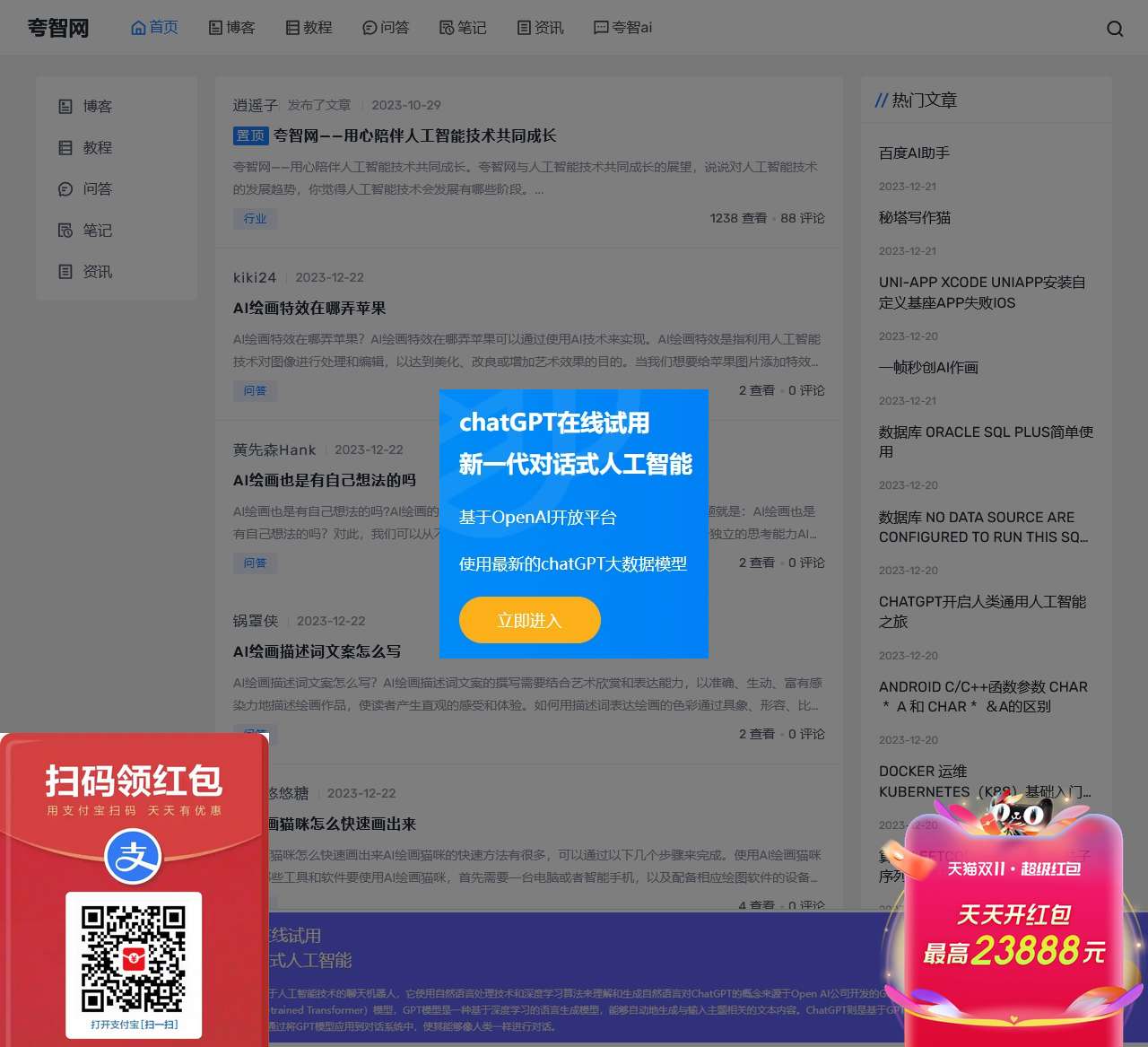 欢迎来到夸智网,一个致力于用心陪伴人工智能技术共同成长的平台。我们为您提供丰富多彩的内容,涵盖博客、教程、问答、笔记和最新资讯。夸智ai板块为您展示了热门的人工智能话题,以及用户间的深度交流。