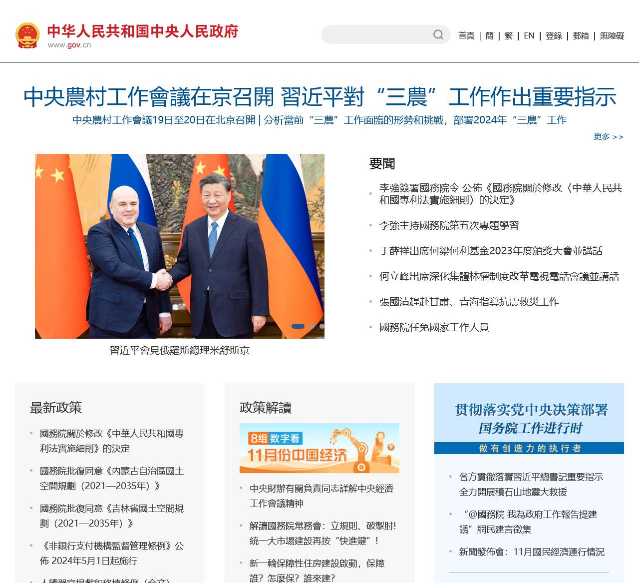 歡迎訪問中國政府網,中央人民政府的官方門戶網站。我們致力於提供最新、最全面的政府信息,以及及時、權威的新聞報導。在這裡,您可以了解到中央農村工作會議、習近平對“三農”工作的指示,以及其他重大事件的相關信息。
