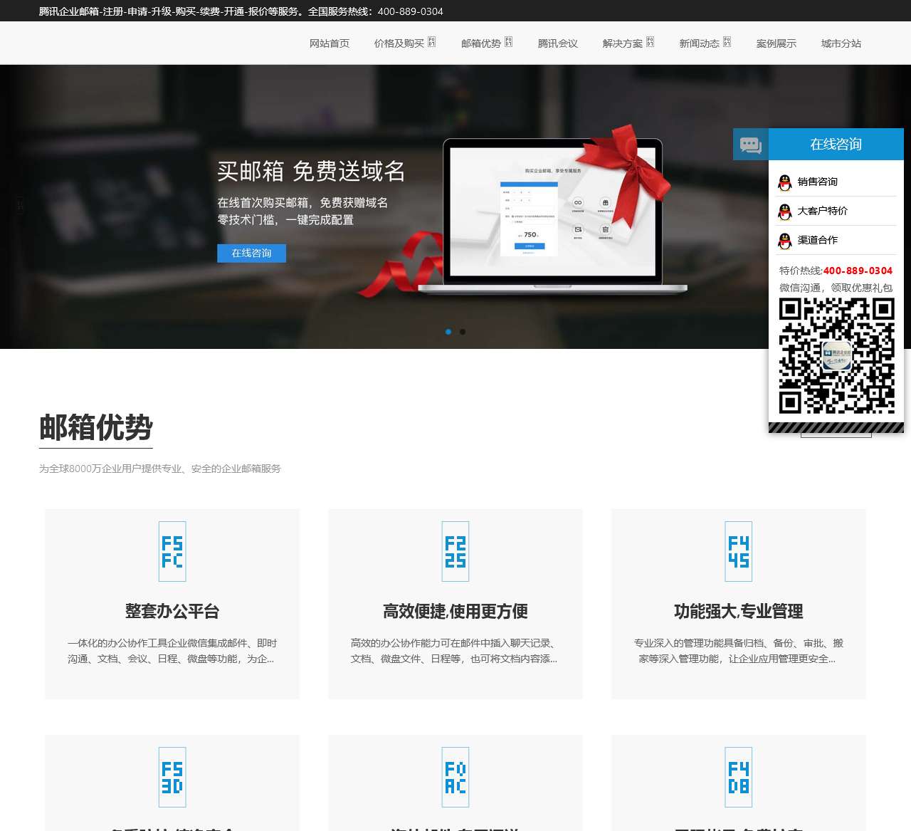 腾讯企业邮箱或QQ企业邮箱注册、申请、办理、升级全国代理商经销商客服电话:400-889-0304。腾讯企业邮箱价格优惠,买1年送1年,买2年送2年!