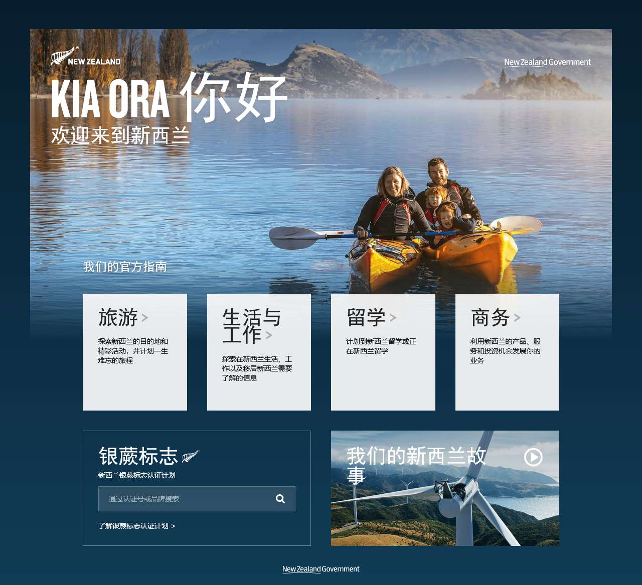 | 探索新西兰的目的地和精彩活动,并计划一生难忘的旅程 | 探索在新西兰生活、工作以及移居新西兰需要了解的信息 | 计划到新西兰留学或正在新西兰留学 | 新西兰的投资机会 | 探索新西兰的产品和服务 | 了解银蕨标志认证计划 |