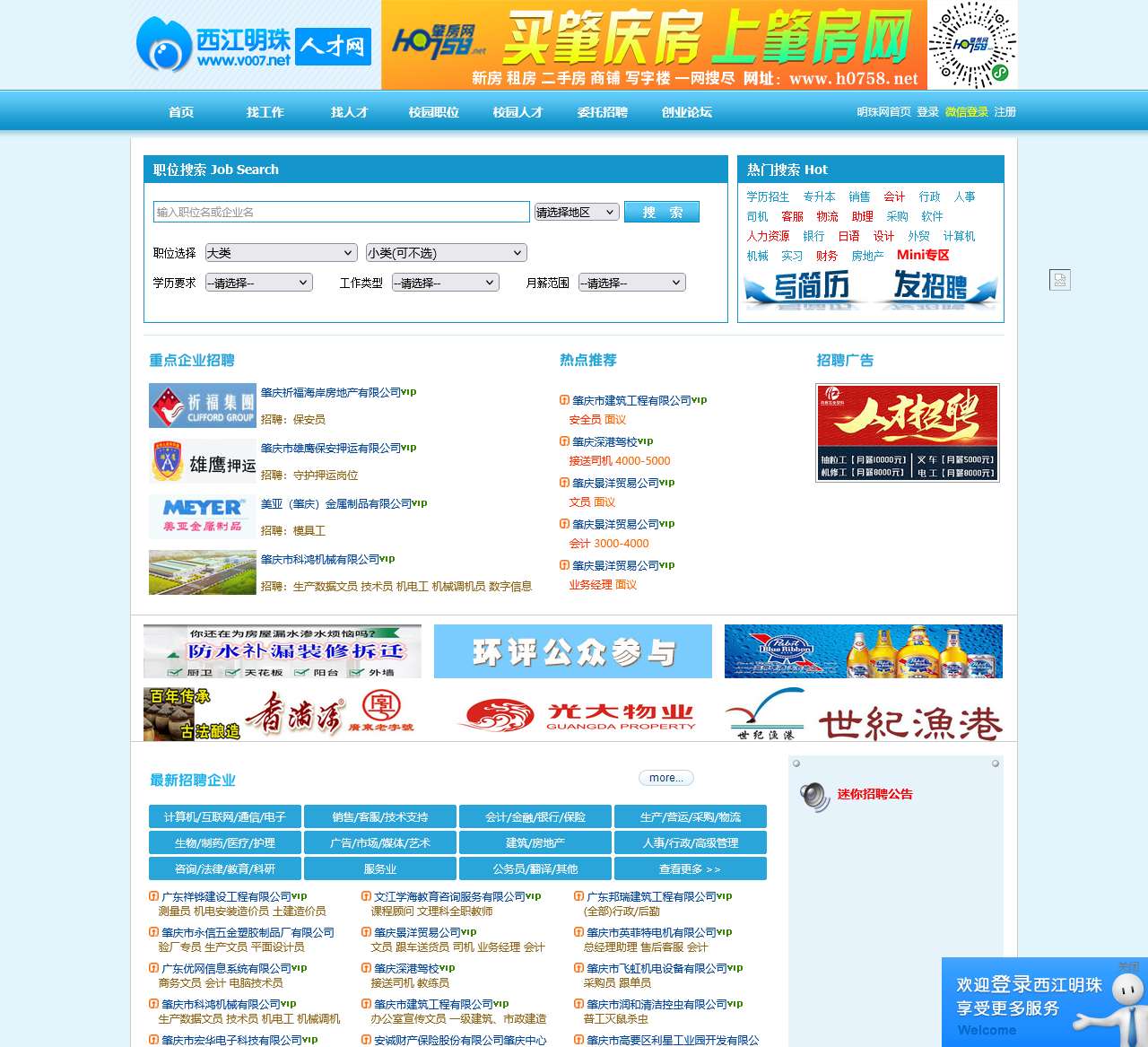 肇庆人才网-肇庆人才招聘网-肇庆明珠人才网,人气最旺的肇庆人才网站,提供肇庆人才招聘信息,肇庆人才网上求职成功率高的肇庆招聘网站,肇庆招聘网服务地区(端州/高要/四会/广宁/鼎湖/德庆/封开/怀集)等,job.v007.net,拥有十万份肇庆人才网上求职简历!